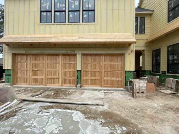 18′ x 8′, 9′ x 8′, cedar garage doors, vertical plank, eyebrow top trim, designed and installed by Doorvana