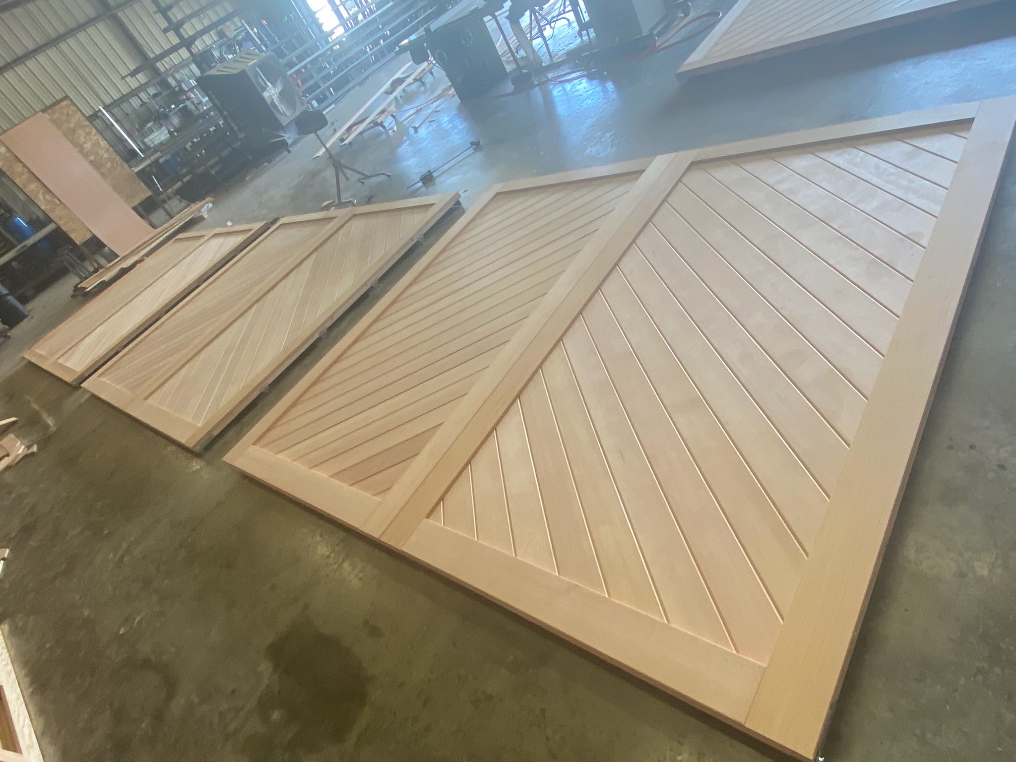 Three 9′ x 8′ Cedar Chevron Garage Doors with Glass Top Section