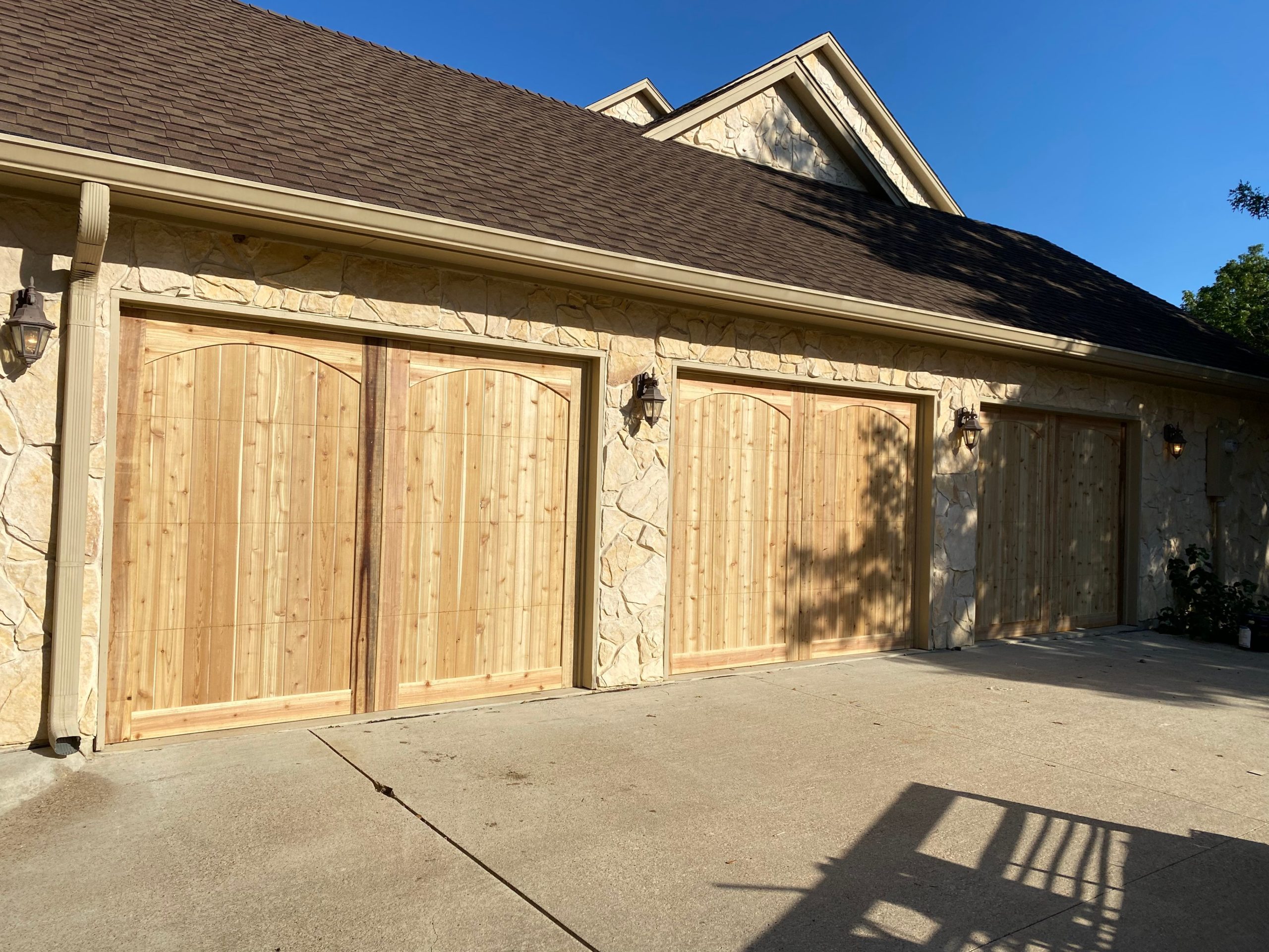18′ x 8′, 9′ x 8′, cedar garage doors, vertical plank, eyebrow top trim, designed and installed by Doorvana